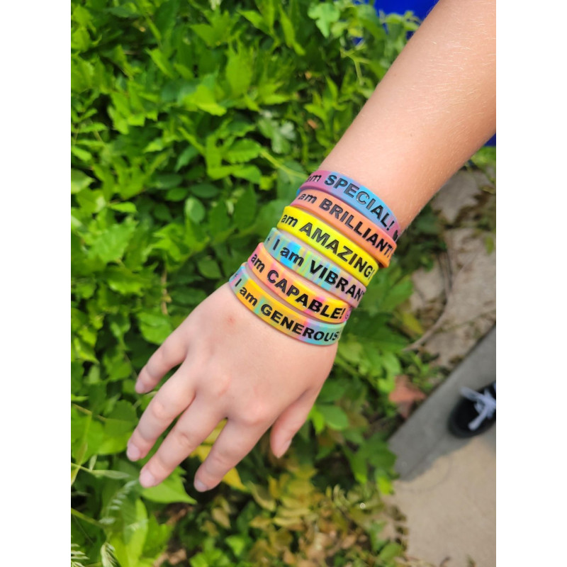 Rubber wrist bracelet bands to hand out after haircuts. Each set is unique to the year and are all multicolored. Also great items to hand out for outreach/promotional events! You will receive a random assortment.